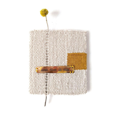 Trama e Natureza traduzidas em têxteis poéticos criados com diferentes fios e cobre texturizado à fogo.